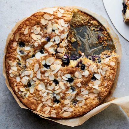 Klop in een andere middelgrote kom de eieren los. Voeg de gesmolten boter, het vanille-extract en de citroenrasp toe en klop tot alles is vermengd. Schep 150 gram bosbessen door het beslag en giet het in de vorm. Strooi de achtergehouden bosbessen over de bovenkant samen met de geschaafde amandelen en bak de taart 50-55 minuten in de oven tot een in het midden van de taart gestoken spies er schoon uit komt. Houd de taart tegen het einde van de baktijd goed in het oog, door het relatief grote aantal eieren in het beslag kan nog enigszins vochtig gebak in enkele minuten te gaar worden.
