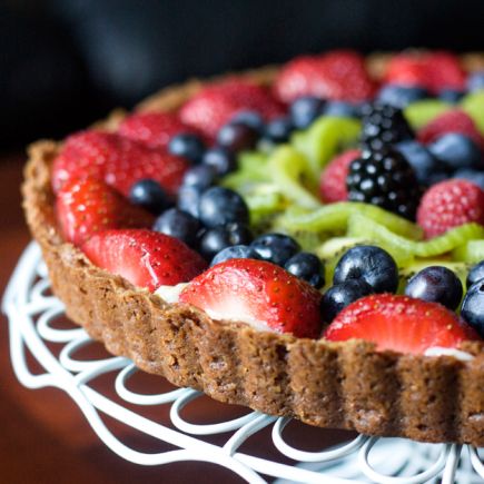 Haal de vorm uit de oven en zet hem circa 30 minuten opzij voor u de taart eruit haalt. Serveer de taart nog wat warm of op kamertemperatuur. Snijd hem liefst met een kartelmes om te voorkomen dat de appelschijfjes scheuren.