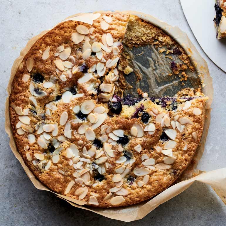 Deze taart bevat een klein beetje bloem om de sappigheid van de bosbessen te compenseren. Hij is supereenvoudig te maken en heerlijk smeuig.